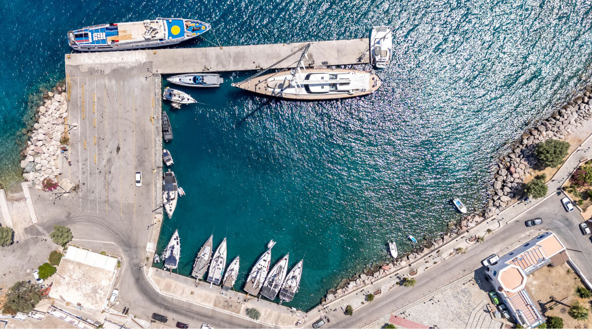 Livadia, Tilos' main harbor, serves as a key maritime gateway to the island. It offers a dedicated marina for recreational yachts and boats, accommodating up to 35 vessels of varying sizes. The harbor provides modern facilities, including freshwater and electricity supply. The external quay features a rectangular pier with dimensions designed to cater to large passenger ferries, catamarans, and yachts. The pier's dimensions are as follows: a long southern side measuring 49.63 meters, a smaller northern side of 25.54 meters, and an eastern frontage of 27.40 meters. The usable depth at the pier is -8.00 meters, ensuring safe docking for a range of vessels.